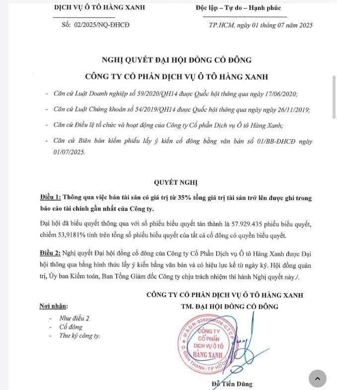 Công ty Cổ phần Dịch vụ Ô tô Hàng Xanh thông báo THÔNG QUA Nghị quyết và Biên bản kiểm phiếu lấy ý kiến cổ đông bằng văn bản bán tài sản giá trị 35% trở lên được ghi vào bctc công ty.
