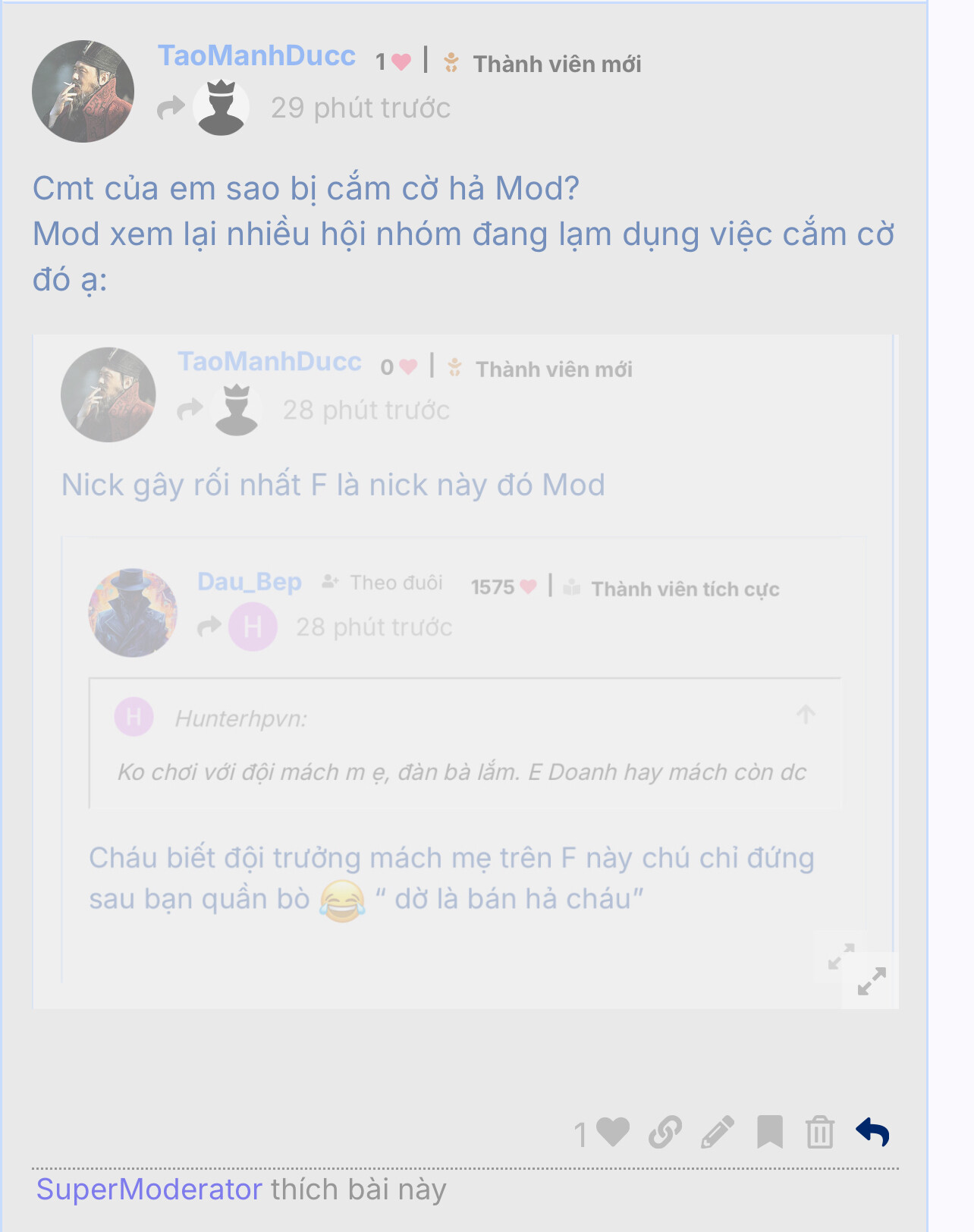 @SuperModerator thật là tôi không muốn phiền mod nhưng mong mod xem xét nick đeo bám, đả kích cá nhân này ạ.