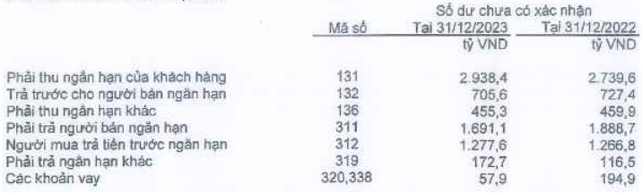 Bên cạnh đó, đơn vị kiểm toán cũng chưa thể thu thập được đầy đủ các thư xác nhận về các số dư nợ phải thu và nợ phải trả tại ngày 31/12/2023 và 31/12/2022.