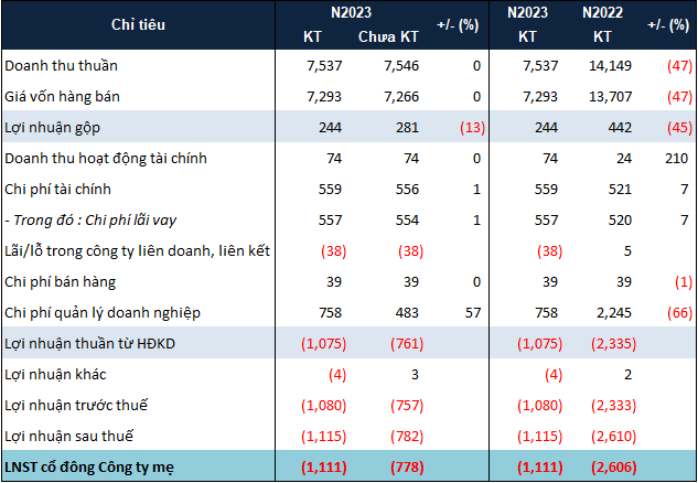 | Kết quả kinh doanh 2023 của HBC sau kiểm toán Nguồn: BCTC kiểm toán 2023 của HBC |