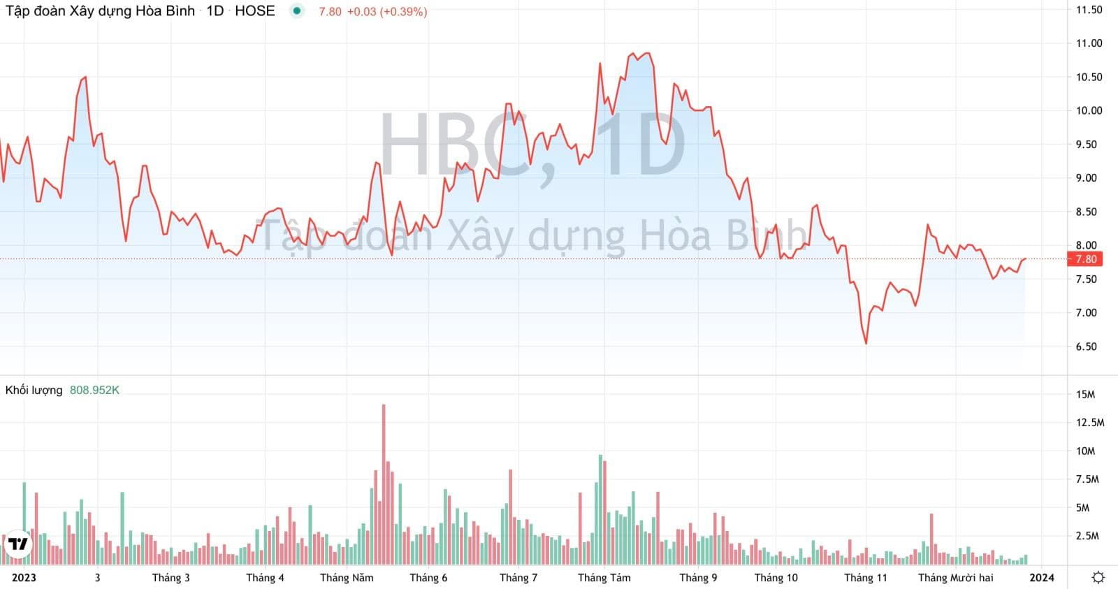 Khối lượng giao dịch và xu hướng giá cổ phiếu HBC của Xây dựng Hoà Bình từ đầu năm 2023 đến nay. (Nguồn: TradingView)