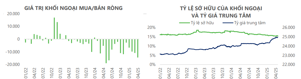 Áp lực tỷ giá vẫn còn hiện hữu tuy nhiên không còn quá lớn nữa, vì vậy kỳ vọng giao dịch bán ròng của khối ngoại sẽ chậm lại trong năm 2025. Đồng thời, tỷ lệ sở hữu của khối ngoại hiện đã xuống mức rất thấp, chỉ còn khoảng 15,5%, nhìn chung dư địa bán của khối ngoại không còn nhiều. Bên cạnh đó, với việc hệ thống KRX chính thức đi vào hoạt động trong Quý 2 và vấn đề về ký quỹ trước giao dịch đã được tháo gỡ cho các nhà đầu tư nước ngoài, TTCK Việt Nam kỳ vọng lớn sẽ được FTSE nâng hạng trong T9/2025, giúp thu hút dòng vốn ngoại. Ước tính dòng vốn từ các quỹ ngoại sử dụng họ chỉ số FTSE là ~1 tỷ USD.