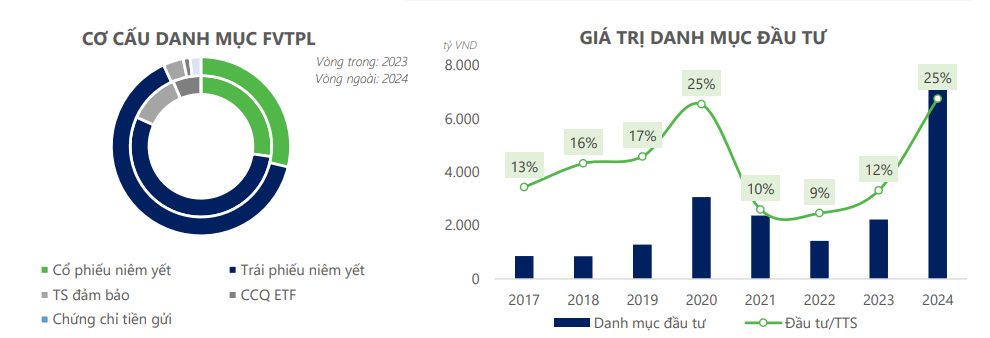 Mảng tự doanh của HSC tập trung vào đầu tư ngắn hạn với danh mục toàn bộ đều là TSTC FVTPL. Tổng giá trị gốc danh mục là gần 7.800 tỷ, tăng gấp 3,5 lần so với đầu năm 2024, tuy tăng mạnh nhưng tương đối thận trọng, tập trung vào các tài sản an toàn như trái phiếu và cổ phiếu blue-chip. Chiếm ~30% danh mục là cổ phiếu và chứng chỉ quỹ ETF, chủ yếu là các mã trong rổ VN30 với một nửa là các mã ngân hàng như STB, MBB, TCB,… Nhìn chung danh mục cổ phiếu đều là các mã vốn hóa lớn, beta dương so với VNIndex. Với kịch bản VNIndex vượt mốc 1.400 điểm trong năm 2025, dự kiến danh mục sẽ tiếp tục có hiệu suất tốt và góp phần tăng trưởng kết quả kinh doanh.