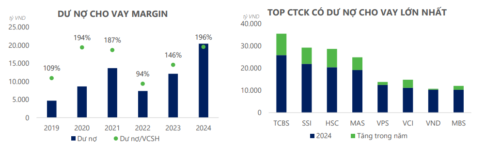 - Dư nợ cho vay toàn thị trường hiện đạt hơn 240.000 tỷ, tương đương tăng tới hơn 30% kể từ đầu năm 2024. Dư địa cho vay của các CTCK ước tính còn khá nhiều với ~250.000 tỷ. Dự báo con số dư nợ cho vay sẽ tiếp tục vượt đỉnh trong năm 2025 nhờ vào sự cải thiện của tâm lý nhà đầu tư khi TTCK chính thức bước vào pha tăng, đồng thời các giải pháp hỗ trợ thanh toán cùng triển vọng nâng hạng sẽ giúp thu hút thêm dòng vốn ngoại vào thị trường.