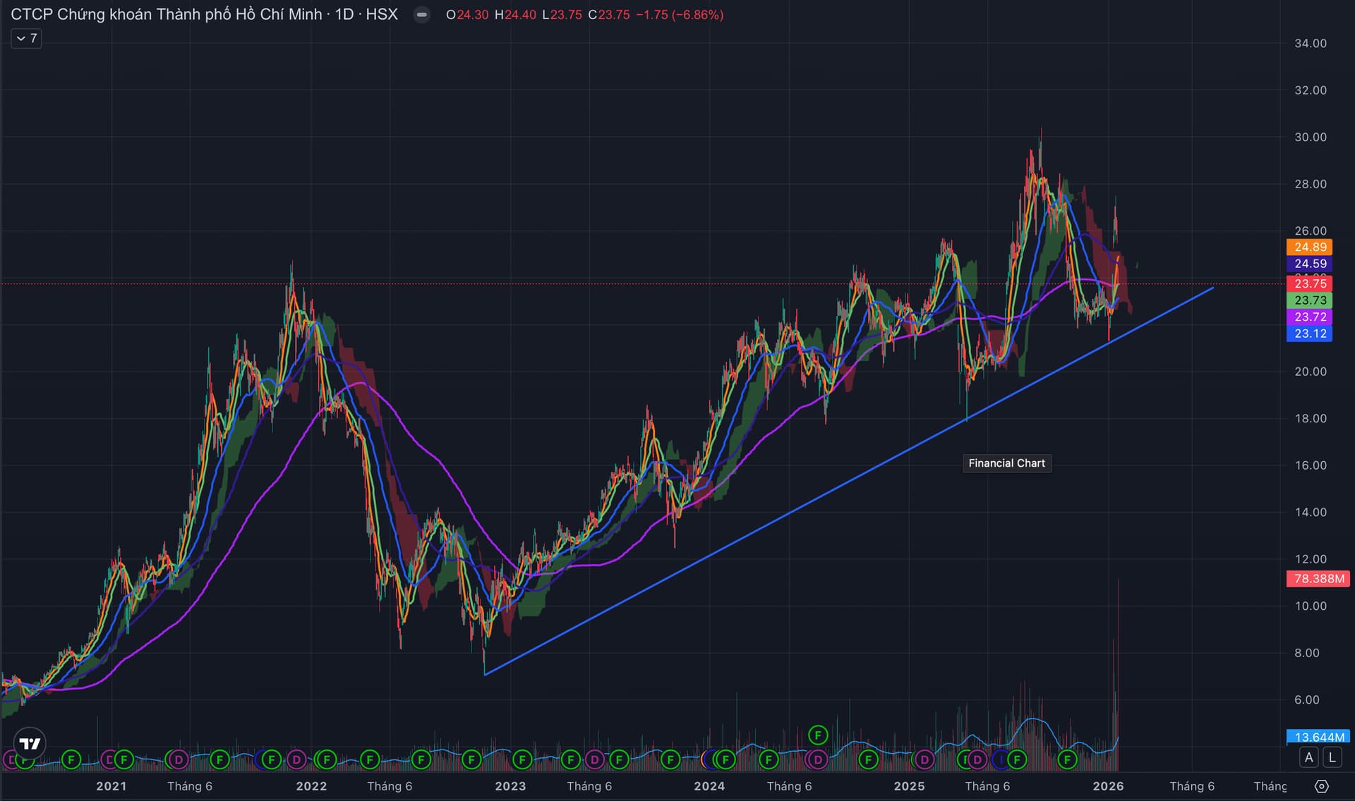 Ngay sau khi HCM công bố báo cáo tài chính quý 4, cổ phiếu này ghi nhận áp lực bán về mức tham chiếu, phản ánh tâm lý hụt hẫng của nhà đầu tư khi kết quả kinh doanh chưa vượt kỳ vọng. Nguyên nhân đến từ sự thay đổi trong danh mục tự doanh. Tại thời điểm cuối quý 3, VNM và VCB đều có mặt trong danh mục đầu tư của HCM, trùng với giai đoạn hai cổ phiếu này tăng giá mạnh trên thị trường giai đoạn vừa rồi. Tuy nhiên, sang quý 4, hai mã này không còn xuất hiện trong danh mục FVTPL, cho thấy HCM đã thực hiện cơ cấu thế trước thời điểm lập báo cáo, khiến kỳ vọng về lợi nhuận tự doanh không được phản ánh trong kết quả quý 4 như nhiều nhà đầu tư chờ đợi.