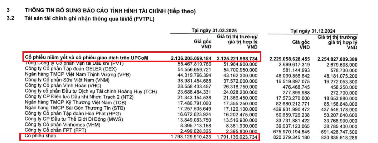 Một điểm đáng chú ý là trong báo cáo, có một phần tài sản ghi nhận là “cổ phiếu khác”, nhưng theo giải trình từ phía công ty thì phần lớn đây là tiền mặt. Điều này cho thấy HSC hiện đang tạm thời đứng ngoài, quan sát thị trường và chờ cơ hội giải ngân rõ ràng hơn. Nếu thị trường có biến động xấu, công ty gần như không chịu ảnh hưởng nhiều từ tự doanh.