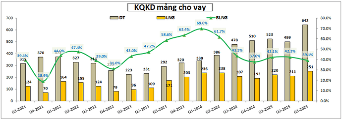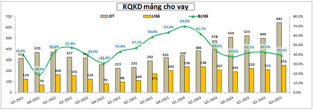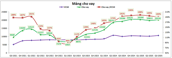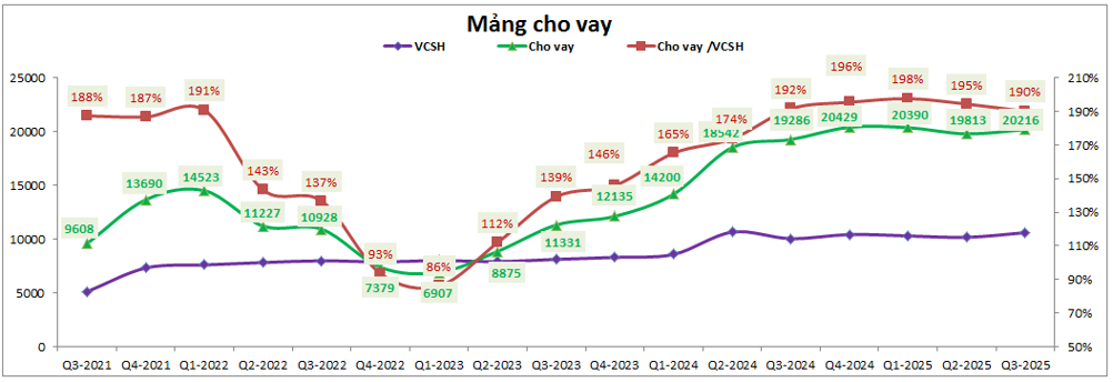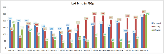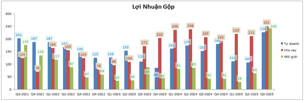 Mảng tự doanh và mảng môi giới là 2 mảng cho thấy sự bứt phá mạnh nhất trong Q3 vừa qua, trong khi đó mảng cho vay vẫn tăng trưởng nhưng với tốc độ thấp do tài sản cho vay đã chạm trần giới hạn cho phép và chưa kịp hoàn tất tăng vốn trong Q3-2025. Chi tiết hơn chúng ta sẽ cùng bóc tách từng mảng kinh doanh trong phần dưới.