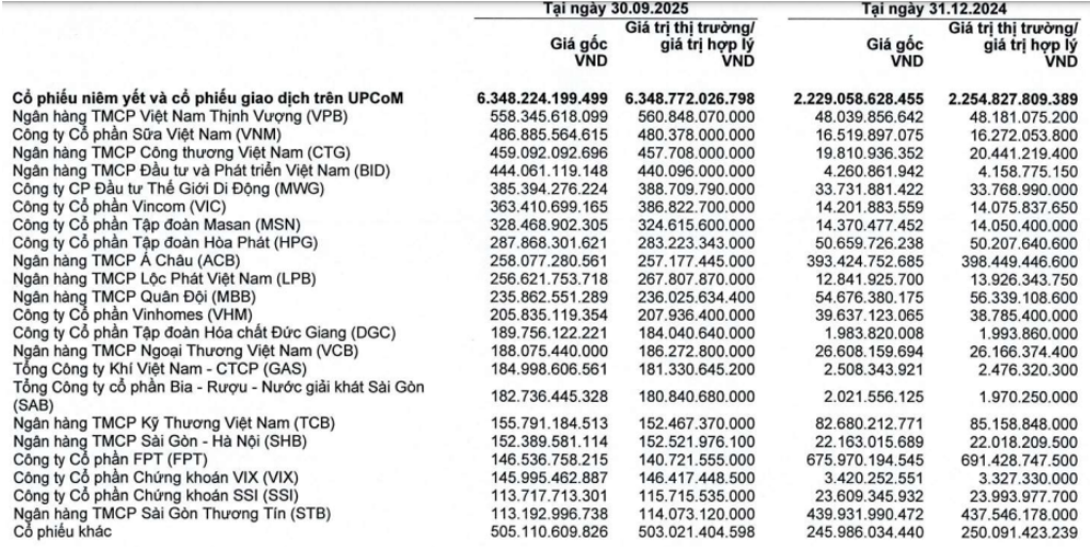 Như vậy có thể thấy HCM đang gần như chia đôi tài sản của mình một nửa vào kênh an toàn như trái phiếu và một nửa nắm giữ cổ phiếu. Đáng chú ý là nếu so với thời điểm các quý trước thì tỉ trọng cổ phiếu trong tự doanh của HCM đã tăng lên khá nhiều vào cuối Q3 khi trước đó chỉ chiếm khoảng 28%. Như vậy nếu không thay đổi tỉ trọng trong Q4 thì với việc thị trường chung đang khó khăn sẽ ảnh hưởng lớn với HCM trong Q4. Hình 6 dưới đây là danh mục chi tiết các cổ phiếu vào cuối Q3-2025: