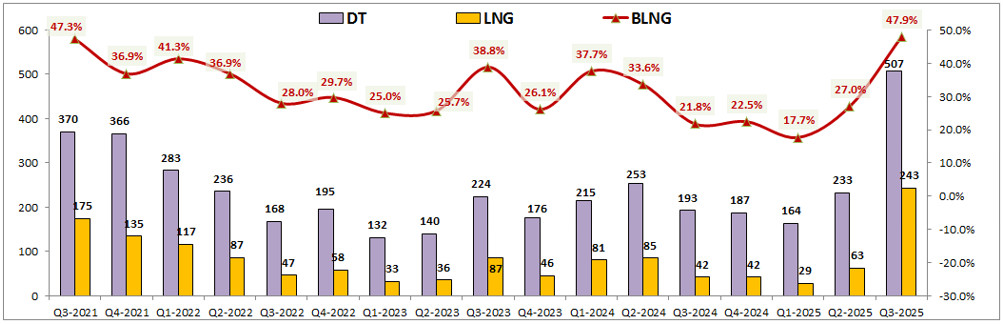 Trong Q3-2025, mảng môi giới bất ngờ ghi nhận KQKD đột biến nhờ thanh khoản thị trường tăng lên nhanh chóng với trung bình 45-50k tỷ đồng mỗi phiên. Doanh thu môi giới đạt 507 tỷ đồng, lợi nhuận gộp đạt 243 tỷ đồng, tăng 5.8 lần so với cùng kỳ. (Hình 7)
