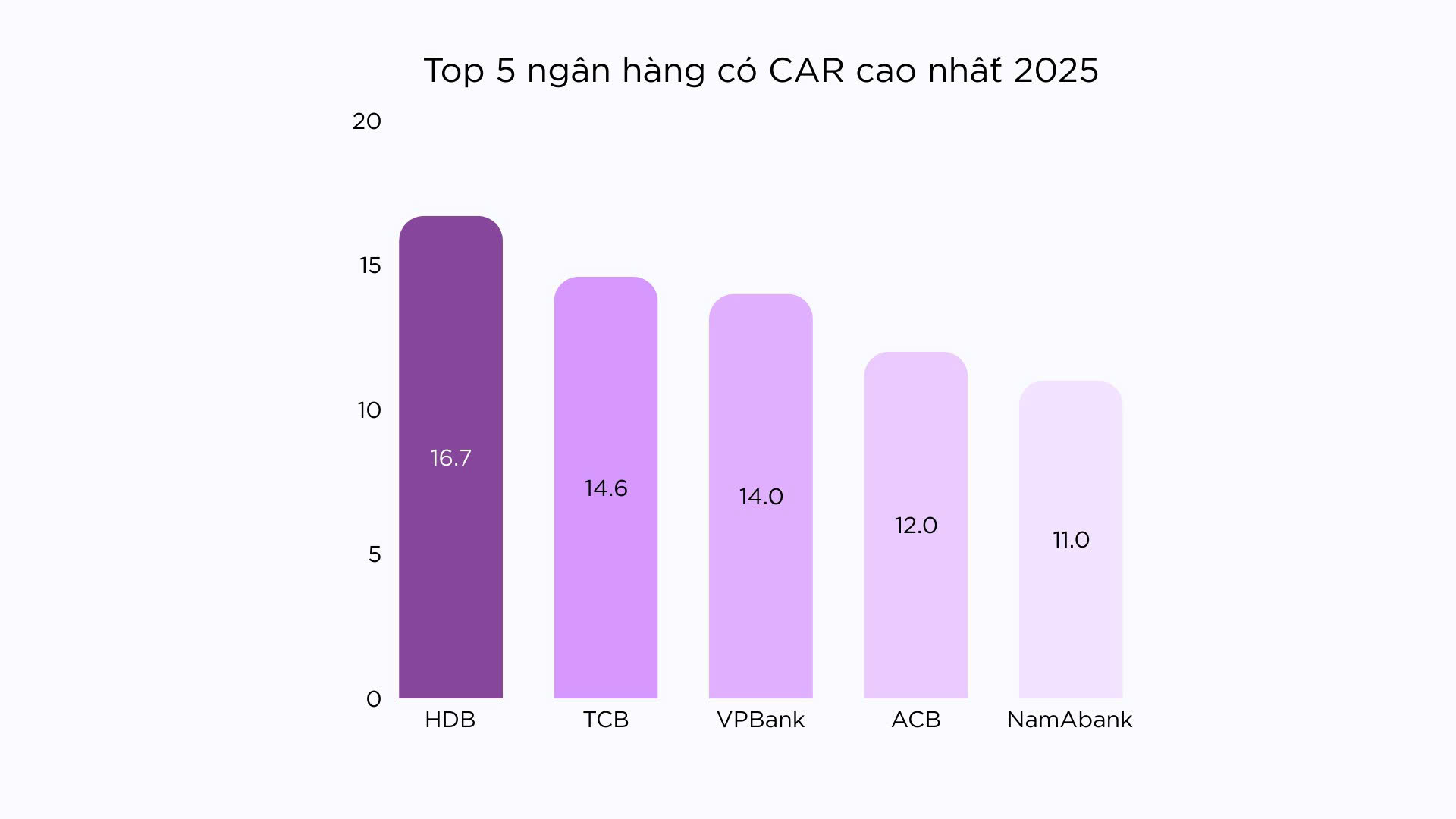 CAR kỷ lục: Theo dữ liệu từ VCBS và Vietcap, HDBank kết thúc năm 2025 với tỷ lệ CAR lên tới 16,7% – mức cao nhất toàn hệ thống. Trong khi các bank khác đang chật vật tăng vốn để duy trì tỷ lệ 11-12%, HDB đang có một “bộ đệm” cực dày.