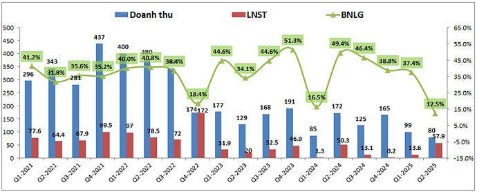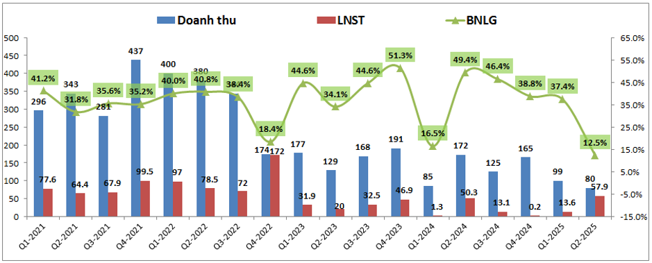 Khi mà mảng chính là hạch toán dự án BĐS chưa có đóng góp mới từ dự án lớn thì HDC bất ngờ có những hỗ trợ từ khoản lợi nhuận bất thường tới từ việc bán vốn dự án. Trước tiên chúng ta điểm qua kết quả kinh doanh Q2-2025 của HDC. Công ty đã ghi nhận doanh thu thuần đạt 80 tỷ đồng, giảm 53.5% yoy. Lợi nhuận sau thuế đạt 57.9 tỷ đồng, tăng 15.1% yoy. (Hình 2)
