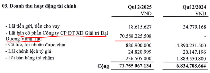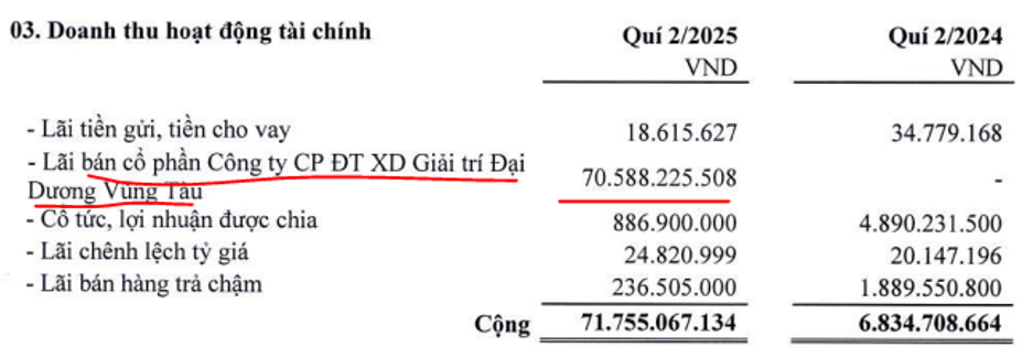 Đáng chú ý, trong Q2-2025 tuy doanh thu thuần chỉ đạt 80 tỷ đồng, lợi nhuận gộp chỉ đạt khoảng 10 tỷ đồng nhưng HDC vẫn ghi nhận lãi sau thuế gần 58 tỷ đồng. Điều này đến từ khoản ghi nhận đột biến từ hoạt động tài chính với doanh thu đạt gần 72 tỷ đồng trong Q2-2025, cao hơn tới 65 tỷ đồng so với cùng kỳ. Xem chi tiết thuyết minh trên báo cáo tài chính thì khoản doanh thu này chủ yếu tới từ khoản bán cổ phần tại CTCP DTXD giải trí Đại Dương Vũng Tàu với 70.6 tỷ đồng. (Hình 3)