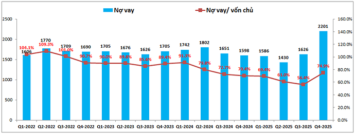 Tiếp theo về nợ vay của công ty, sau giai đoạn giảm dần vào cuối 2024, đầu 2025 thì nợ vay của HDC có xu hướng tăng trở lại trong 2 quý gần đây. Tổng nợ vay tăng lên 2,201 tỷ đồng vào Q4-2025, tăng hơn 600 tỷ đồng so với đầu năm. Tỉ lệ nợ vay/VCSH cũng ở mức cao với 74.9%. (Hình 3)