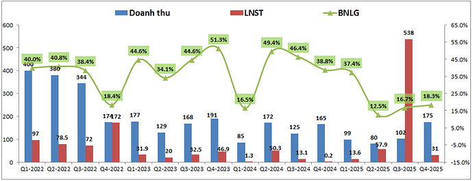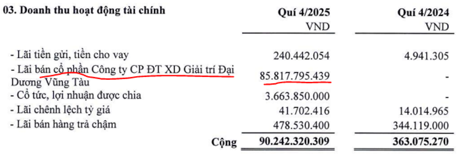 Kết quả tốt là nhờ động lực từ việc tiếp tục ghi nhận một phần lợi nhuận khi công ty tiến hành thoái vốn khỏi ctcp dtxd Đại Dương với doanh thu ghi nhận trong Q4-2025 là 85.8 tỷ đồng. (Hình 2)