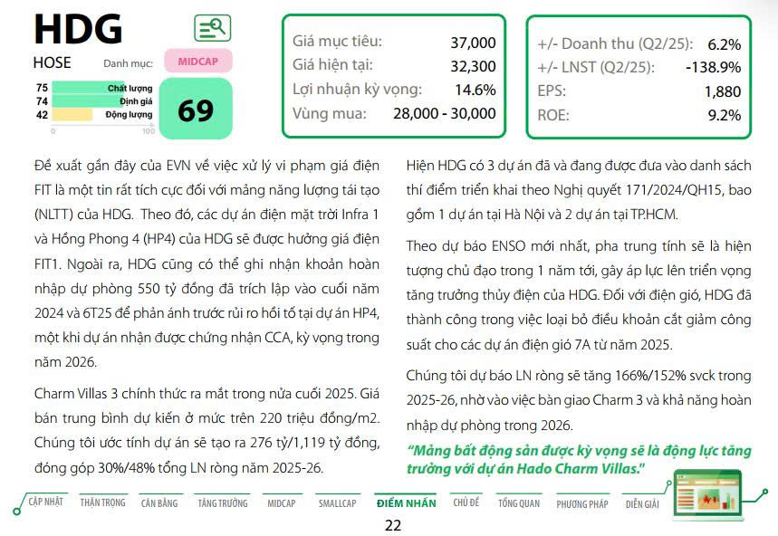 Hiện duy trì khuyến nghị MUA đối với cổ phiếu HDG, với giá mục tiêu 37.700 đồng/cp, nhờ triển vọng tăng trưởng ổn định ở mảng năng lượng – đặc biệt là thủy điện, cùng với tiềm năng hồi phục của mảng bất động sản từ năm 2026.