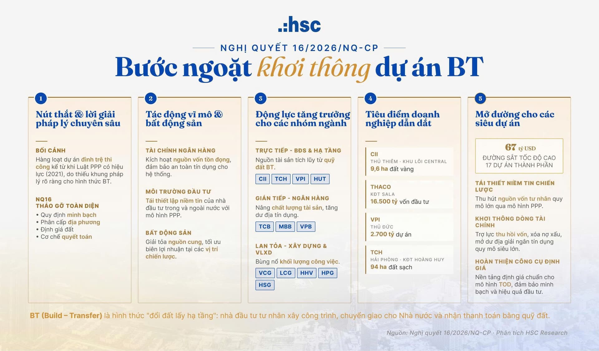 Ngành xây dựng hưởng lợi từ giải ngân đầu tư công +18%, nguồn cung căn hộ tăng, NOXH +50%, các dự án đường sắt lớn (Bến Thành – Cần Giờ, Hà Nội – Hải Phòng – Lào Cai) và vành đai chiến lược.