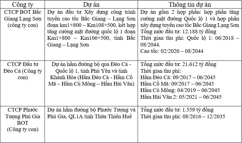 Từ 2019 ĐHCĐ của công ty đã đưa ra chủ trương đầu tư vào các dự án BOT hạ tầng giao thông đường bộ. 3 công ty con là 3 doanh nghiệp dự án – chủ đầu tư của các dự án BOT hạ tầng giao thông. Các dự án hiện tại đã xây dựng xong, đang chờ quyết toán.