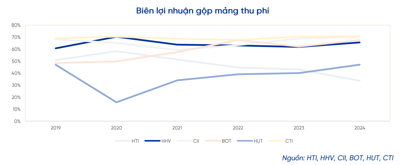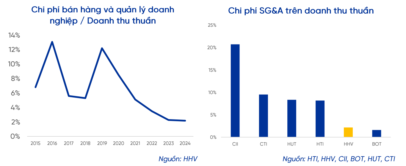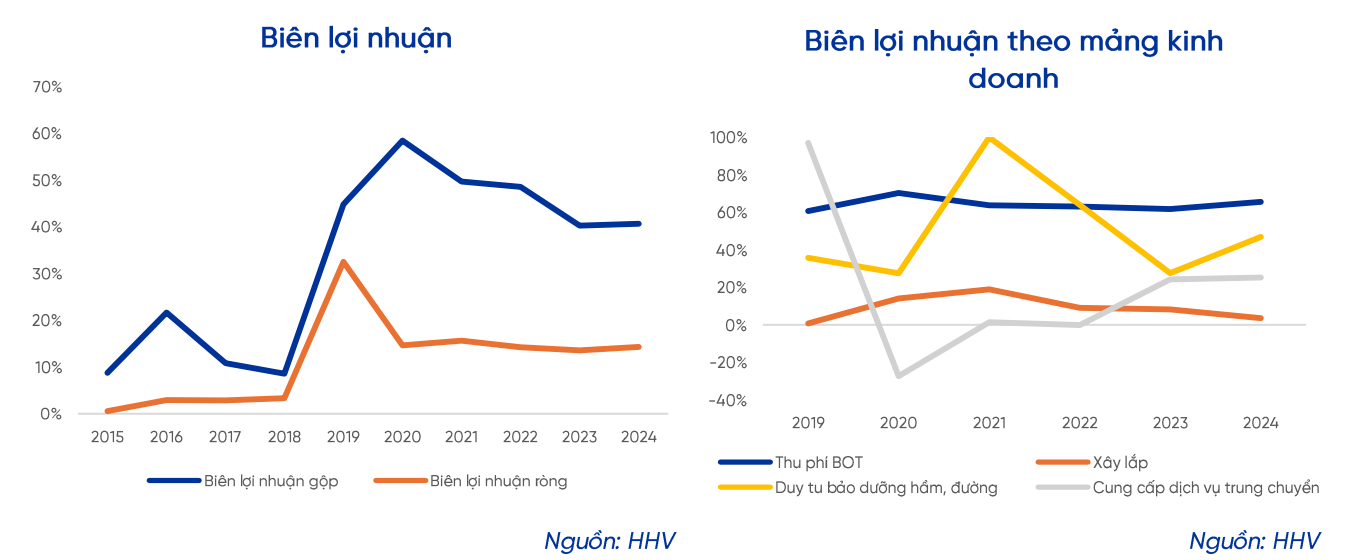 Nhìn chung, biên lợi nhuận gộp của HHV đang ghi nhận xu hướng giảm kể từ đỉnh năm 2020. Nguyên nhân chủ yếu đến từ sự thu hẹp biên lợi nhuận của mảng xây lắp, được giải thích bởi việc đảm nhận thi công các hạng mục có kết cấu đơn giản. Về mảng thu phí từ dự án BOT, HHV vẫn duy trì được biên lợi nhuận ổn định và cao so với các đối thủ.