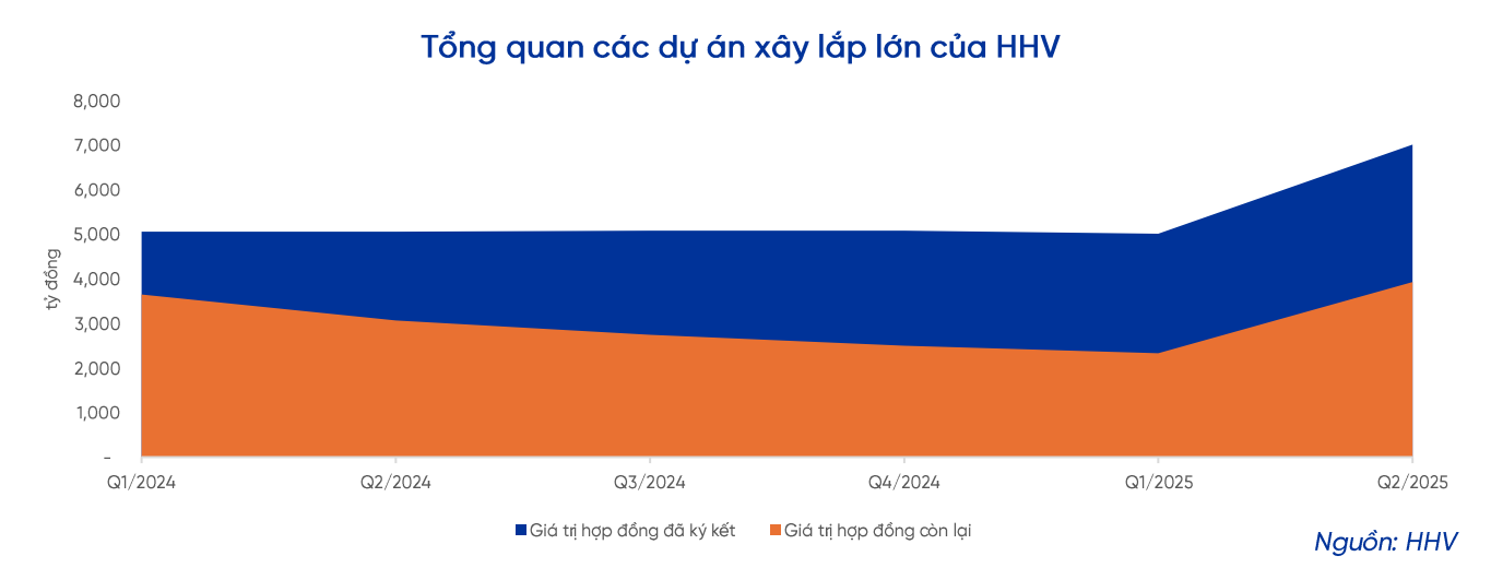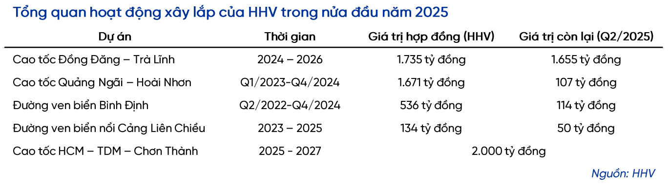 Chúng tôi tin rằng mảng xây lắp sẽ có được tăng trưởng ổn định trong một vài năm tới vào lượng backlog đến từ dự án Cao tốc Hồ Chí Minh - Thủ Dầu Một - Chơn Thành. Tính đến thời điểm Q2/2025, giá trị sản lượng còn lại của HHV đạt gần 200 tỷ đồng (chưa tính dự án mới).