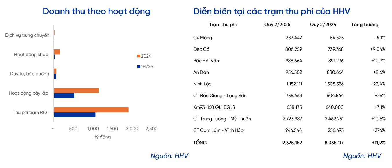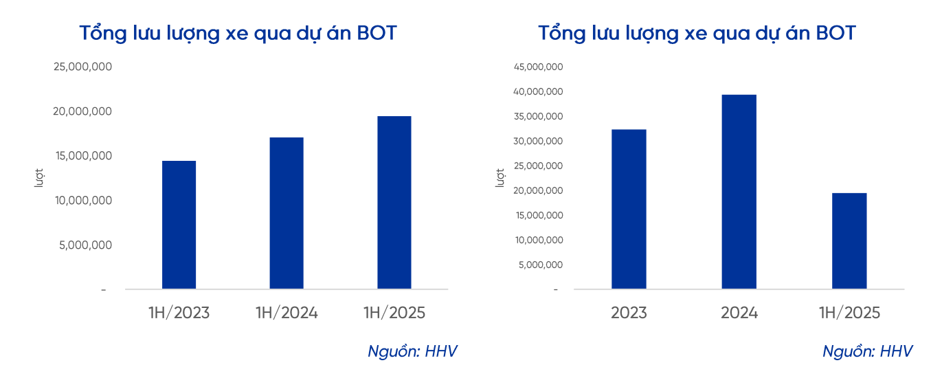 Mức tăng trưởng tổng lưu lượng xe qua trạm phí của HHV trong 1H/2024 và 1H/2025 lần lượt là 18,25% và 14,01% so với cùng kỳ.