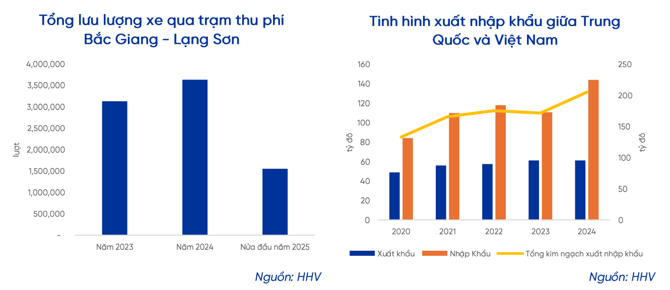 Dự án cao tốc Đồng Đăng - Trà Lĩnh được đánh giá cao nhờ vị trí chiến lược, góp phần hoàn thiện mạng lưới kết nối từ Thủ đô đến các tỉnh biên giới và cửa khẩu trọng điểm. HHV hiện cũng là nhà đầu tư tại cao tốc Bắc Giang - lạng Sơn, tuyến đường có đặc điểm địa lý tương đồng và đã ghi nhận tăng trưởng lưu lượng xe tích cực trong năm 2024. Do đó, hai tuyến cao tốc này kỳ vọng sẽ tạo hiệu ứng bổ trợ, qua đó thu hút lưu lượng phương tiện lớn khi cùng đi vào khai thác, nhờ kết nối hạ tầng đồng bộ và vai trò chiến lược trong giao thương biên giới.