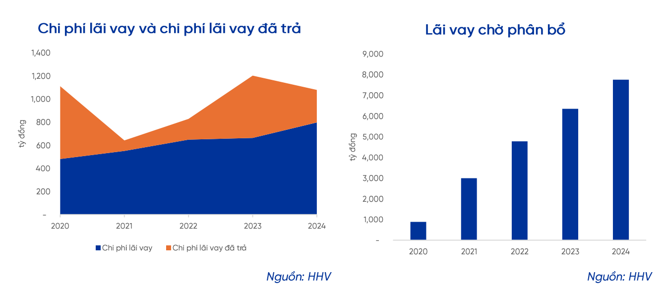HHV đang sử dụng khoản mục ‘lãi vay chờ phân bổ’ và ‘chi phí lãi vay phải trả’ như một công cụ để làm mềm biến động chi phí tài chính và ổn định lợi nhuận kế toán trong giai đoạn đẩy mạnh đầu tư. Tuy vậy, số liệu cho thấy công ty vẫn đang thực hiện chi cho lãi vay ở mức cao, phản ảnh áp lực tài chính hiện hữu là đáng kể.