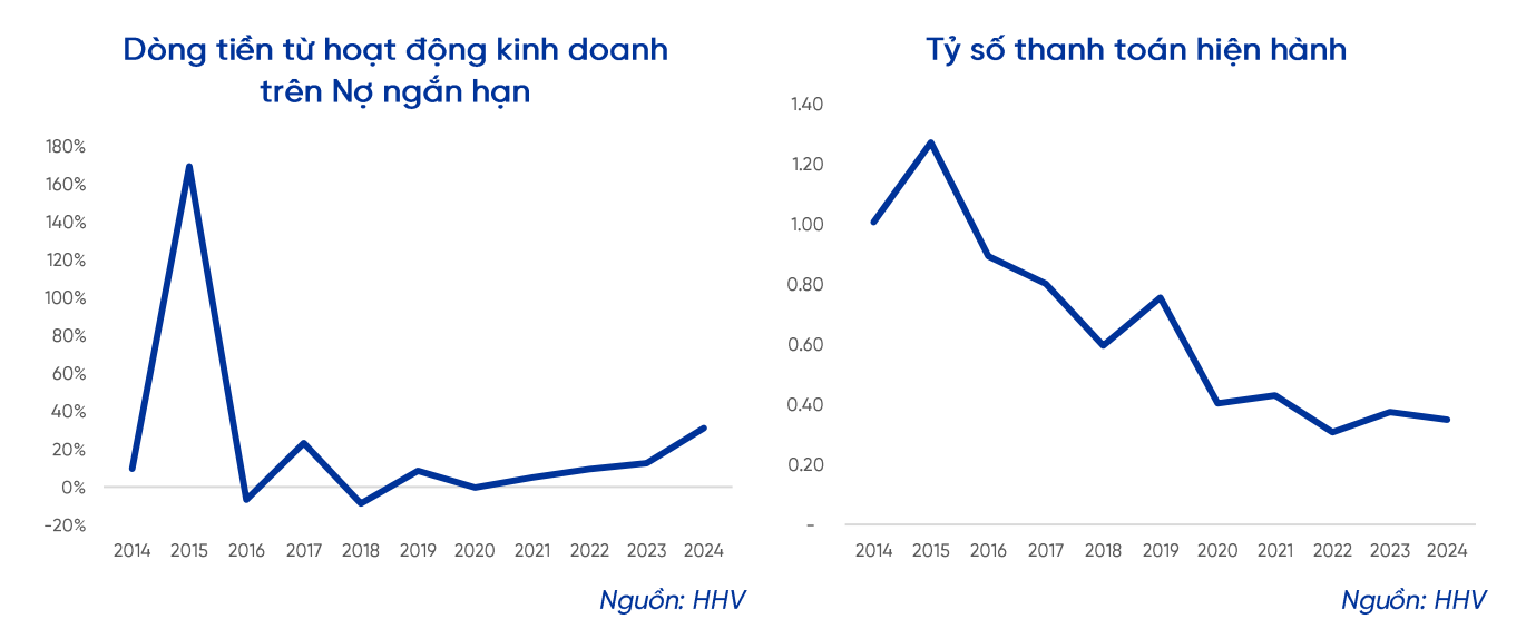 Mặc dù dòng tiền từ hoạt động kinh doanh của HHV ghi nhận diễn biến tích cực trong vài năm qua, các chỉ số thanh khoản của công ty vẫn đang cho thấy sự suy yếu, chủ yếu đến từ nhu cầu đầu tư dự án và chi phí lãi vay wor mức cao.