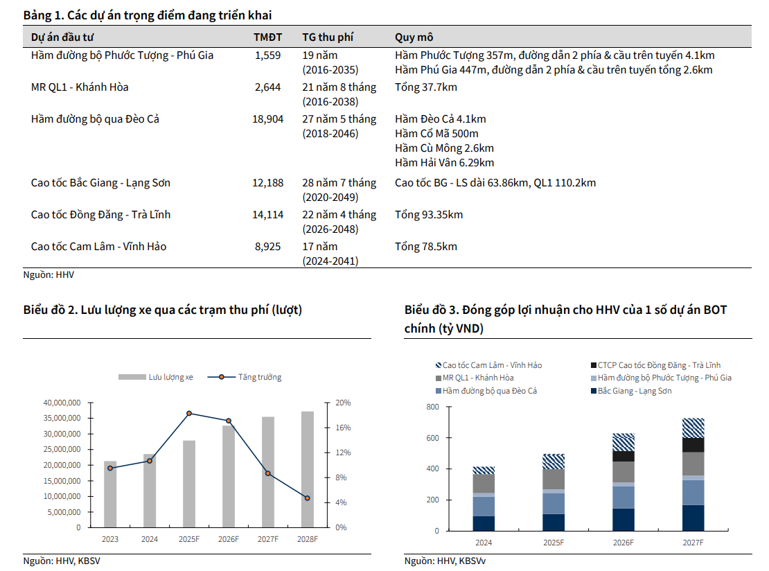 Ngoài các dự án BOT đang triển khai (chi tiết bảng 1) đem lại dòng tiền ổn định cho doanh nghiệp trong dài hạn (hoạt động thu phí BOT đóng góp hơn 70% vào tổng doanh thu HHV với mức biên lợi nhuận gộp lên đến hơn 60%), HHV được đánh giá có triển vọng cao tiếp tục trúng thầu các dự án hạ tầng giao thông mới giai đoạn 2026 – 2030 dựa trên hồ sơ năng lực đã được khẳng định, kinh nghiệm triển khai nhiều dự án khó, góp phần mở rộng quy mô tài sản BOT, đảm bảo dòng tiền chủ chốt cho doanh nghiệp. Cụ thể: