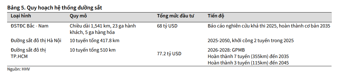 - HHV có cơ hội lớn từ các dự án đường sắt (tổng mức đầu tư dự kiến lên đến 166 tỷ USD) như đường sắt tốc độ cao Bắc – Nam, 3 tuyến kết nối Trung Quốc bao gồm Lào Cai – Hà Nội – Hải Phòng (được Quốc hội thông qua tháng 2/2025), Hà Nội – Lạng Sơn, Hải Phòng – Hạ Long – Móng Cái và tuyến metro đô thị Hà Nội, TP.HCM. Với kinh nghiệm thi công hầm, cầu và nền đường, HHV có thể đảm nhận các gói EPC phần thô trị giá hàng nghìn tỷ đồng, tăng mạnh doanh thu xây lắp giai đoạn 2026–2035 và củng cố vị thế trong lĩnh vực hạ tầng quốc gia.