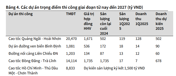 Cuối 2024, giá trị sản lượng xây lấp còn lại của HHV ghi nhận 3,996 tỷ VND, tương đương 3.5 lần doanh thu xây lắp ghi nhận 2024, đảm bảo nguồn công việc cho HHV trong 2-3 năm tới. Cao tốc Quảng Ngãi – Hoài Nhơn và Đồng Đăng – Trà Lĩnh dự kiến sẽ đóng góp chính vào doanh thu 2 năm tới do 2 dự án này đều đến hạn hoàn thành vào năm nay và năm sau.