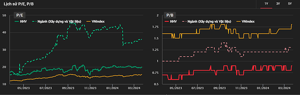 - P/E và P/B của HHV lần lượt là 19.9 và 0.9 ở mức thấp so với ngành, đặc biệt là P/B hiến tại đang dưới 1.