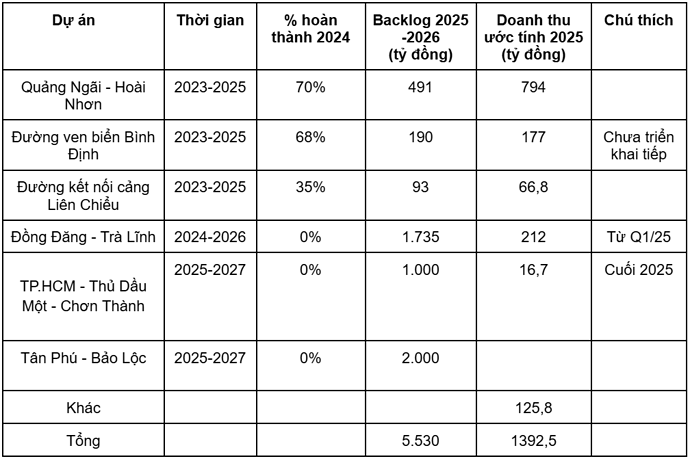 - Mảng xây lắp ghi nhận lượng backlog lên tới 5.530 tỷ đồng, doanh thu 2025 ước đạt gần 1.400 tỷ đồng. Đây cũng là động lực tăng trưởng chính trong bối cảnh tình hình đầu tư công đang được Chính phủ quyết liệt đẩy mạnh.