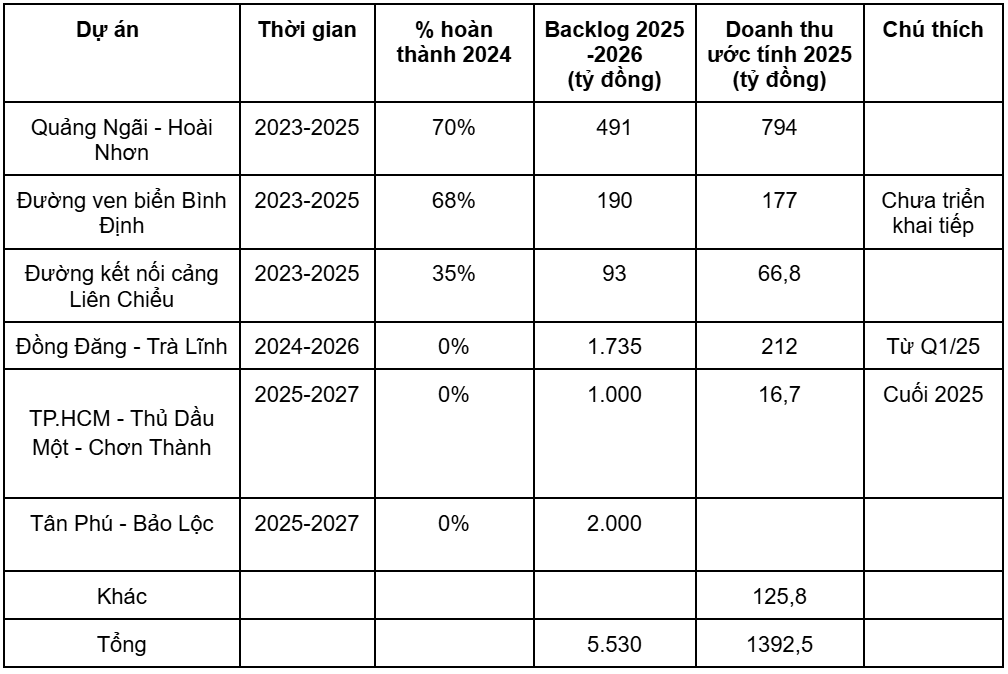 Ngoài ra, động lực tăng trưởng của HHV sẽ đến từ 3 dự án mới được khởi công kể từ đầu 2024 đến nay, bao gồm: 1) Đồng Đăng - Trà Lĩnh; 2) Hữu Nghị - Chi Lăng; 3) TP.HCM - Thủ Dầu Một - Chơn Thành; và một số dự án khác đang triển khai trong năm 2025. Dự án Đồng Đăng - Trà Lĩnh dự kiến tạo ra 210 tỷ đồng doanh thu vào năm 2025, chiếm 15% tổng doanh thu ước tính và được hoàn thành vào 2027 theo đúng tiến độ. Trong khi đó, dự án TP.HCM - Thủ Dầu Một - Chơn Thành đang được xúc tiến để giải phóng mặt bằng, đẩy nhanh tiến độ.