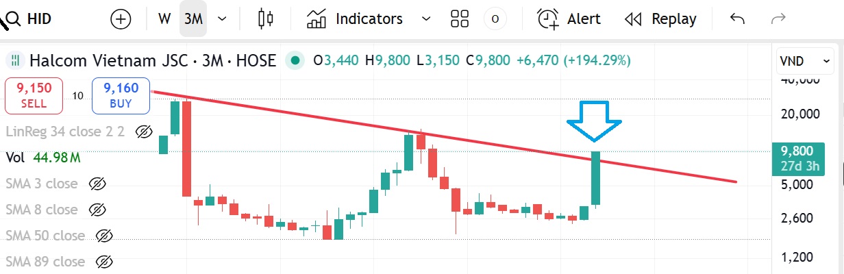 Trong tất cả các loại kháng cự của 1 cổ phiếu chứng khoán, thường gọi là cản (Résistance). Thì cản chéo Diagonal Resistance là cản khó vượt qua nhất vì nó hình thành theo chuỗi kháng cự kéo dài nhiều năm tháng. Nếu giá cắt lên trên cản chéo, cỏ phiếu thường có xu hướng trở về đỉnh cũ cao nhất và có thể vượt lên cao hơn nữa. Những cản khác không phải là trở ngại. Cho nên trên thế giới, có cả 1 trường phái chỉ bắt đầu mua vào khi 1 cổ phiếu chính thức vượt qua được cản chéo dài hạn từ 3 năm trở lên, và họ đã luôn thành công. Xin chúc mừng các cụ nào đang còn nắm giũ HID. HÔM NAY HID ĐÃ CHÍNH THỨC VƯỢT QUA CẢN CHÉO KÉO DÀI 9 NĂM, TÍNH TỪ 2016. Cho nên đây là thời điểm nhà đầu tư có thể hoàn toàn an tâm mua vào HID, chứ không phải là lúc để bán ra.
