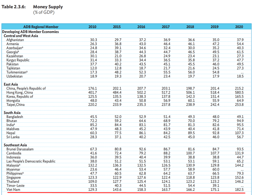 VN đi theo bước anh Hai phương Bắc - “bơm tiền đổi GDP”. Nhìn thống kê bên dưới sẽ rõ. Tỷ lệ M2/GDP Việt Nam cao số 1 ĐNA; ở Châu Á chỉ sau mỗi anh Hai thôi.