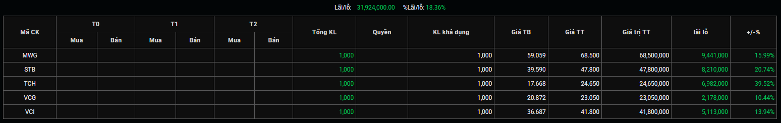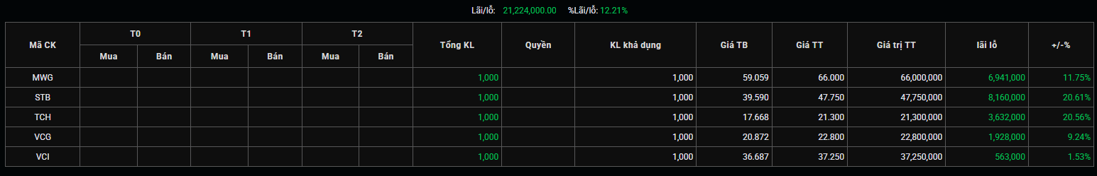 Dưới đây là danh mục mẫu trong Q2 vừa qua gồm 5 mã MWG, STB, TCH, VCG, VCI được mình giải ngân vào ngày 24.04 với tỉ trọng 25% mỗi mã. Tính đến thời điểm hiện tại đã có 2 mã lời 20%. Danh mục dự kiến đóng vào 24.07. Danh mục Q3 đang chuẩn bị và sẽ được trình làng !
