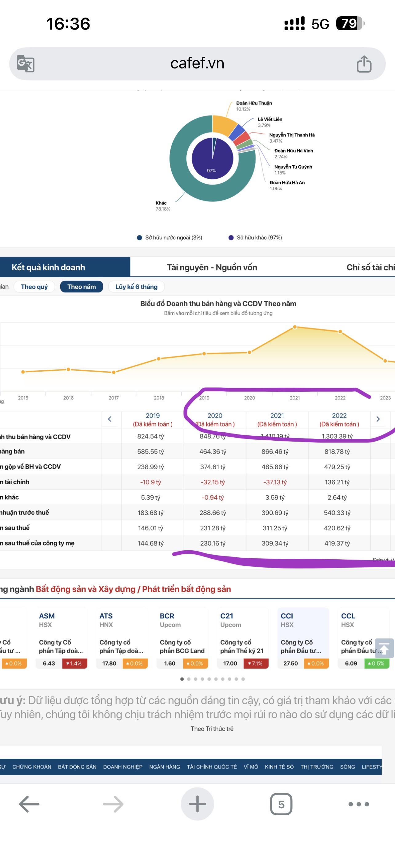 Quý 3 năm 2019 HDC khởi công dự án The Light City giai đoạn 1 diện tích 27ha, cổ bắt đầu nhúc nhích, vốn hoá dao động 800-1200 tỷ, loanh quanh 1000 tỷ. Tới quý tháng 12/2020 dự án bắt đầu bán, và cũng nhân tiện bán thêm 1 chút đồi Ngọc Tước 2,… tính tổng 2020-2021 lãi 230+310 tỷ =540 tỷ, tới 2022 thêm 4xx tỷ nữa, nhưng vì thị trường thuận lợi nên mới 2021 cổ đã tăng hơn 10 lần so với vốn hoá 2019, dù lợi nhuận đem cho cổ đông mới mới được phân nửa vốn hoá…và dự án chỉ đang bán nửa chừng (HDC thường chi 10% lnst chia khen thưởng phúc lợi - nên 540 tỷ tương đương cổ đông lợi ích 490 tỷ = 1/2 vốn hoá 2019).
