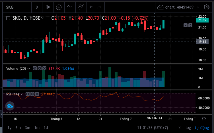 SKG cũng là 1 case có chart tương tự CTD. Tăng với thanh khoản cao, vượt đỉnh, tích luỹ rồi lại tăng tiếp. Upside còn nhiều hơn CTD