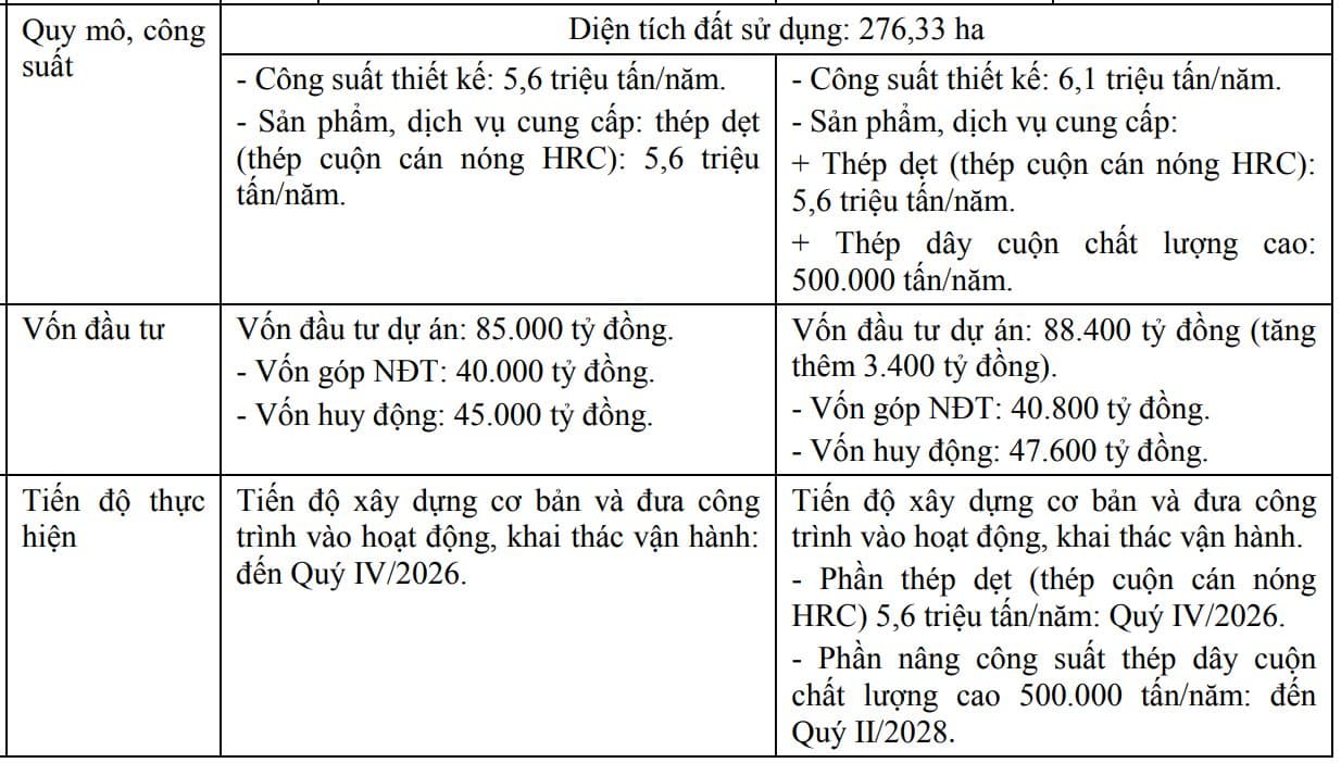 Sau điều chỉnh, tổng công suất thiết kế của Dung Quất 2 tăng từ 5,6 triệu tấn lên 6,1 triệu tấn/năm, chủ yếu là 500.000 tấn thép dây cuộn chất lượng cao – sản phẩm bổ sung mới.