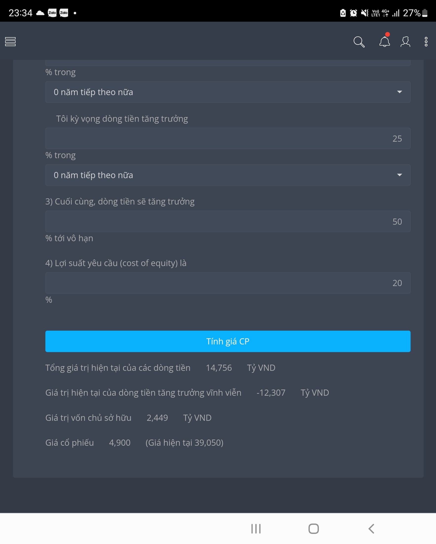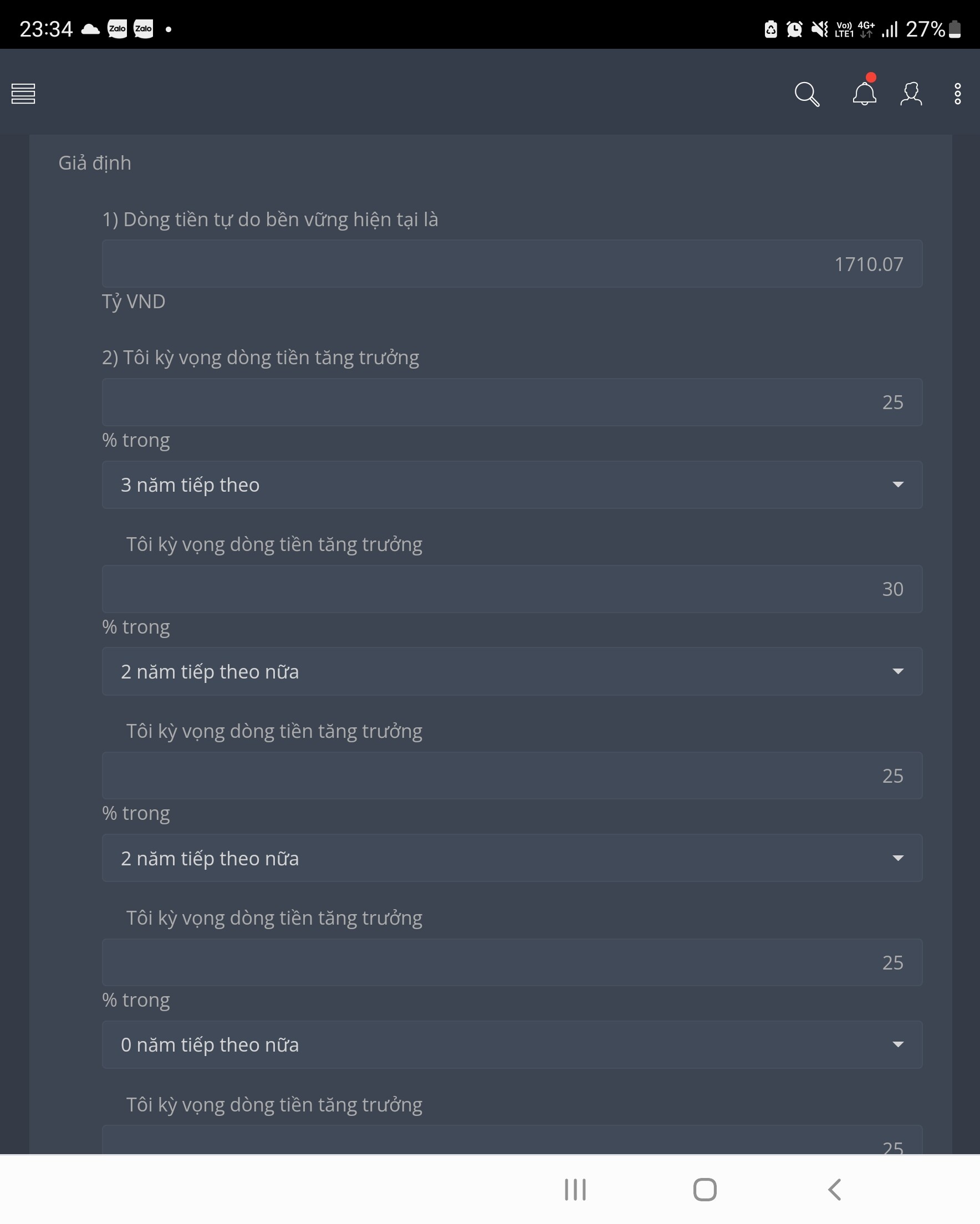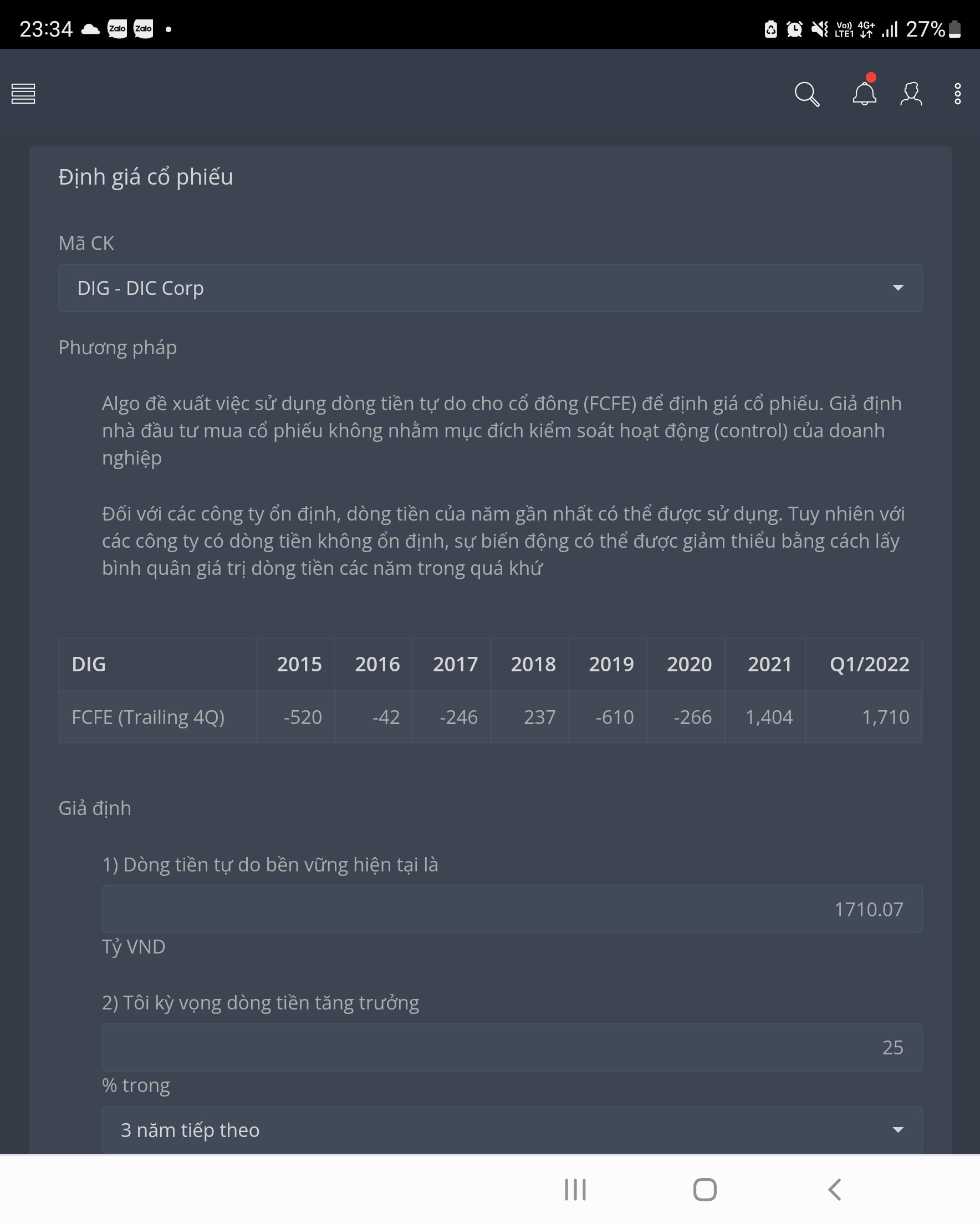 Xem phần mềm nó định giá dig với dòng tiền tăng trươbgr và lợi nhuận tăng trưởng~ 25%/năm thì sao nhé.