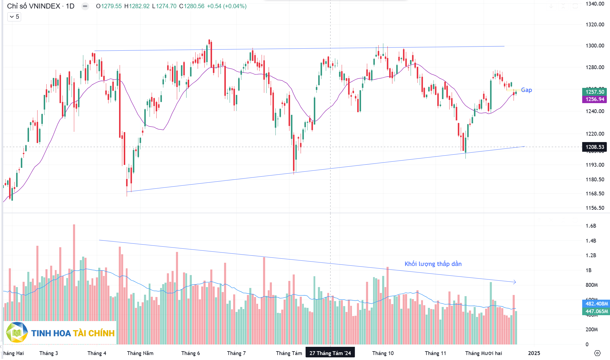 Điểm xoay chiều của thị trường ở phiên 19.12.2024 khi thị trường mở gap giảm điểm với khối lượng lớn. Với việc Fed giảm số lần giảm lãi suất trọng năm 2025 đã làm sự kỳ vọng của nhà đầu tư giảm xuống, thể hiện rõ qua chỉ số DXY bật tăng qua vùng 108 mạnh mẽ. Đồng thời NHNN đã thực hiện bán USD để kiềm hãm tỷ giá, với bối cảnh hiện tại việc lãi suất VNĐ khó giảm thêm nên việc tỷ giá tăng cũng sẽ làm cho NHNN rơi vào thế khó trong việc duy trì mức lãi suất như hiện tại.