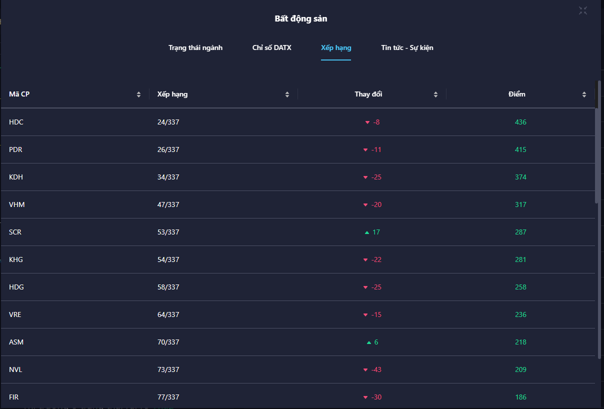 Còn bất động sản thì rating chỉ đứng thứ 8/18, không hấp dẫn bác ạ, chi tiết các cổ bất động sản ở đây bác nhé: XWealth