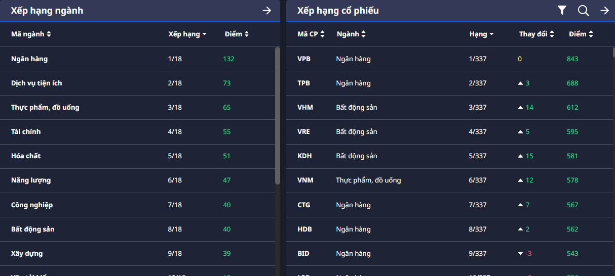 Hiện tại các ngành và cổ phiếu đang rating cao vẫn là VPB, TPB, VHM, VRE và KDH. Bác cứ theo AI của DATX ra khuyến nghị cụ thể thì tham gia nhé ![]()
