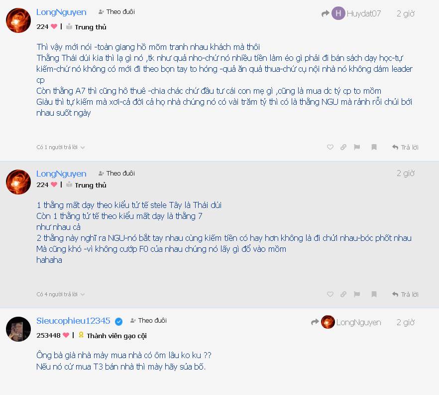 Còn cái thằng đi mạo như thằng @ThaiPham1982 này thì chỉ làm xấu hổ tổ tông dòng họ, đẻ ra đéo dám dùng tên họ cha mẹ đặt, sống đéo dám dùng tư duy bản lĩnh bản thân. Cũng chỉ là con giun đất ngoi lên cho nta dẫm vào mặt mà thôi.