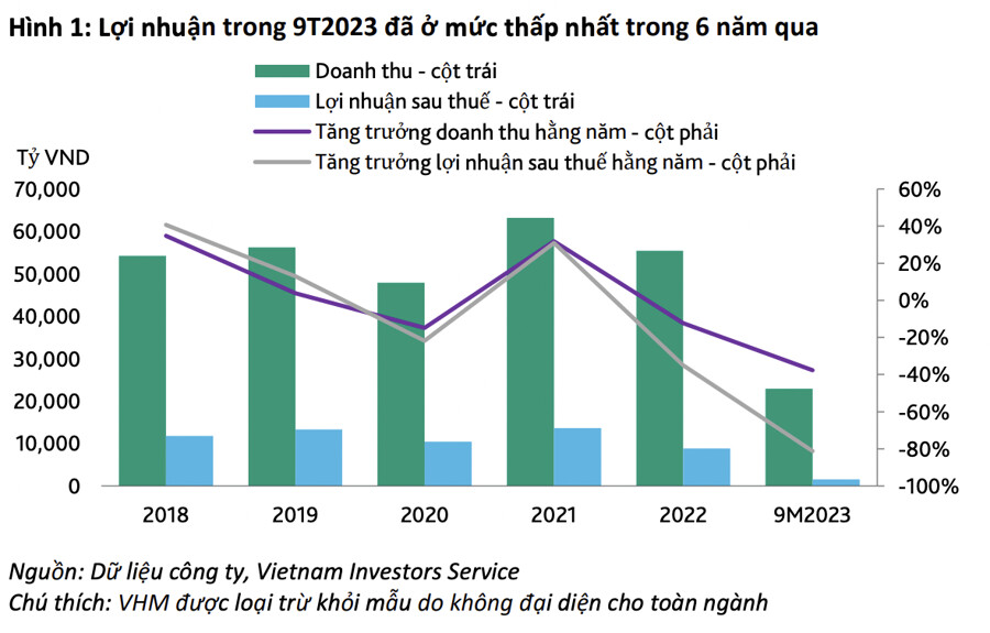 VIS Rating, đơn vị xếp hạng tín nhiệm có vốn đầu tư của Moody’s vừa có báo cáo cập nhật nhóm bất động sản trong đó thống kê cho thấy doanh thu và lợi nhuận của các công ty phát triển bất động sản trong 9T2023 giảm đáng kể lần lượt là 38% và 81% so với cùng kỳ, xuống mức thấp nhất trong sáu năm qua do hoạt động kinh doanh cốt lõi sụt giảm trong bối cảnh cung và cầu yếu.