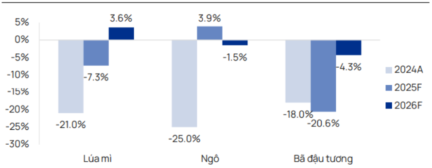 - Về giá TĂCN: Mặc dù tự chủ 100% TĂCN trong mô hình kinh doanh, nhưng tới 70% nguyên liệu này vẫn được nhập khẩu từ nước ngoài, nên bất cứ sự tăng/giảm nào trong cấu thành sản phẩm cũng sẽ ảnh hưởng tới biên lãi của HPA. Chúng tôi có tham khảo báo cáo về Triển vọng Thị trường Hàng hóa (CMO) trong tháng 10.2025, dự báo về thị trường giai đoạn 2025 - 2026, thì Ngân hàng Thế giới dự phóng giá lúa mì giảm mạnh 7,3% trong năm 2025, sau đó phục hồi nhẹ 3,6% trong năm 2026. Giá ngô được dự phóng phục hồi nhẹ 3,9% trong năm 2025, sau đó giảm nhẹ 1,5% trong 2026. Giá bã đậu tương được dự phóng tiếp tục suy yếu trong dài hạn. Để dễ theo dõi thì chúng tôi xin tổng hợp trong ảnh dưới đây. (Hình 3)