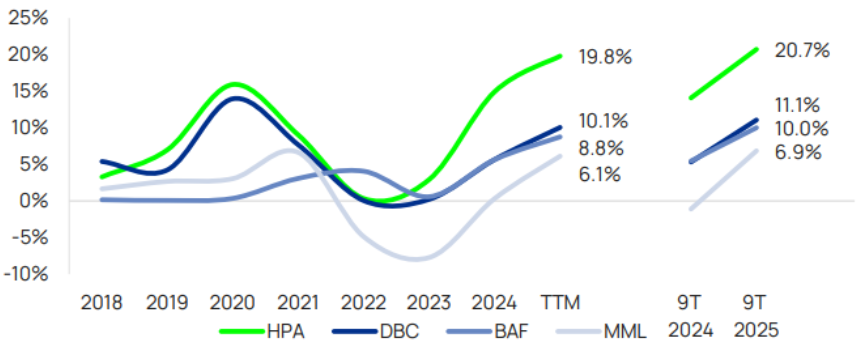- 2023 – 9T25: Đây là giai đoạn phục hồi mạnh từ đáy nhờ chi phí đầu vào giảm, trong khi giá heo cao hơn nhờ nguồn cung thắt chặt do dịch bệnh quay trở lại. Bên cạnh đó, việc mở rộng công suất trong giai đoạn trước dù khó khăn đã giúp HPA có lợi thế tốt để quay trở lại đà tăng trưởng.