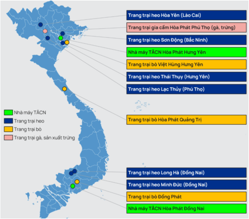 Về các trang trại của HPA, thì các cơ sở chăn nuôi của doanh nghiệp này tập trung chủ yếu ở miền Bắc, và 1 trang trại bò ở miền trung; 2 trang trại heo và 1 trang trại bò cùng 1 nhà máy sản xuất TĂCN tại miền Nam. Hiện tại, khách hàng của HPA tập trung chủ yếu ở miền Bắc, khi hơn 50% doanh thu đến từ khu vực này. Khu vực miền Nam chiếm hơn 50%, phù hợp với vị trí phân bổ các trang trại của doanh nghiệp này.