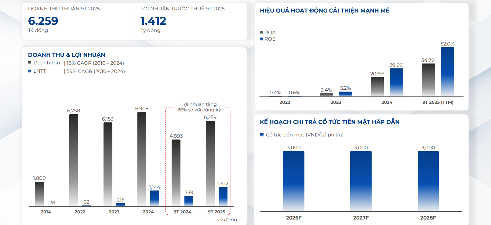 ROE TTM 9T2025 đạt mức 52%.