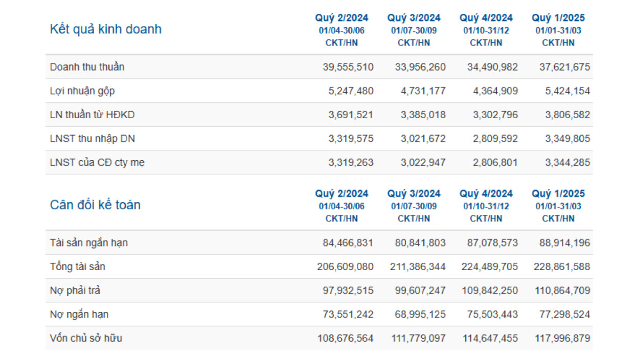 Trong quý 1/2025, Hòa Phát ghi nhận doanh thu thuần đạt 37.621 tỷ đồng, tăng 9% so với quý trước và 22% so với cùng kỳ năm 2024. Lợi nhuận sau thuế đạt 3.349 tỷ đồng, tăng 19% QoQ và 17% YoY, cho thấy sự hồi phục mạnh mẽ của hoạt động sản xuất – kinh doanh trong bối cảnh thị trường thép có dấu hiệu phục hồi và chi phí đầu vào ổn định.